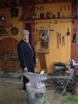 an langen, hohen Holzwänden, an die Dutzende Werkzeuge genagelt waren, die man braucht, um im